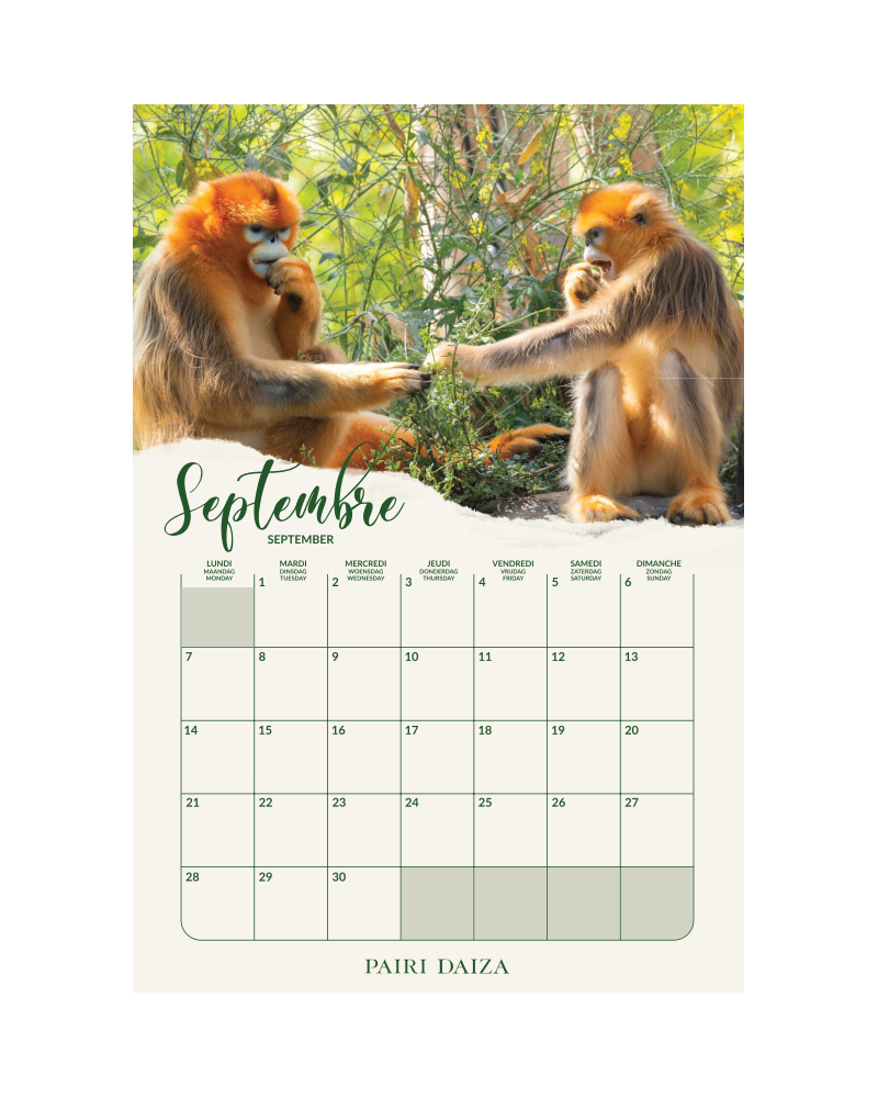Planifiez votre année avec émerveillement et nature grâce au calendrier mural Pairi Daiza 2026. Chaque mois vous transporte dans l’univers enchanteur du parc, avec une sélection de superbes photographies animalières capturant les résidents les plus emblématiques de Pairi Daiza.