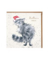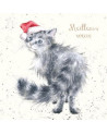 Carte de vœux décorée d'un adorable chat gris portant un chapeau de Noël.