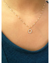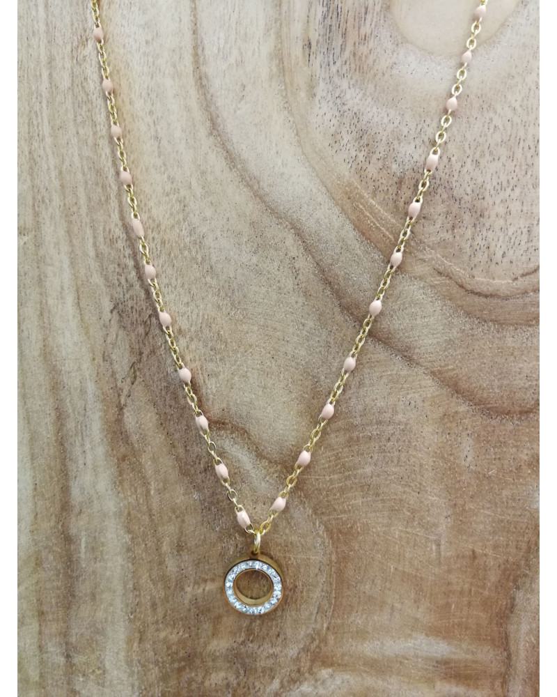 Chaîne dorée avec perles de couleur et pendentif cercle doré serti de strass.