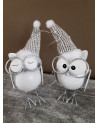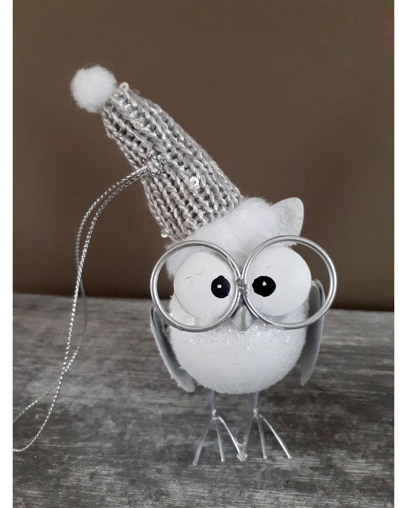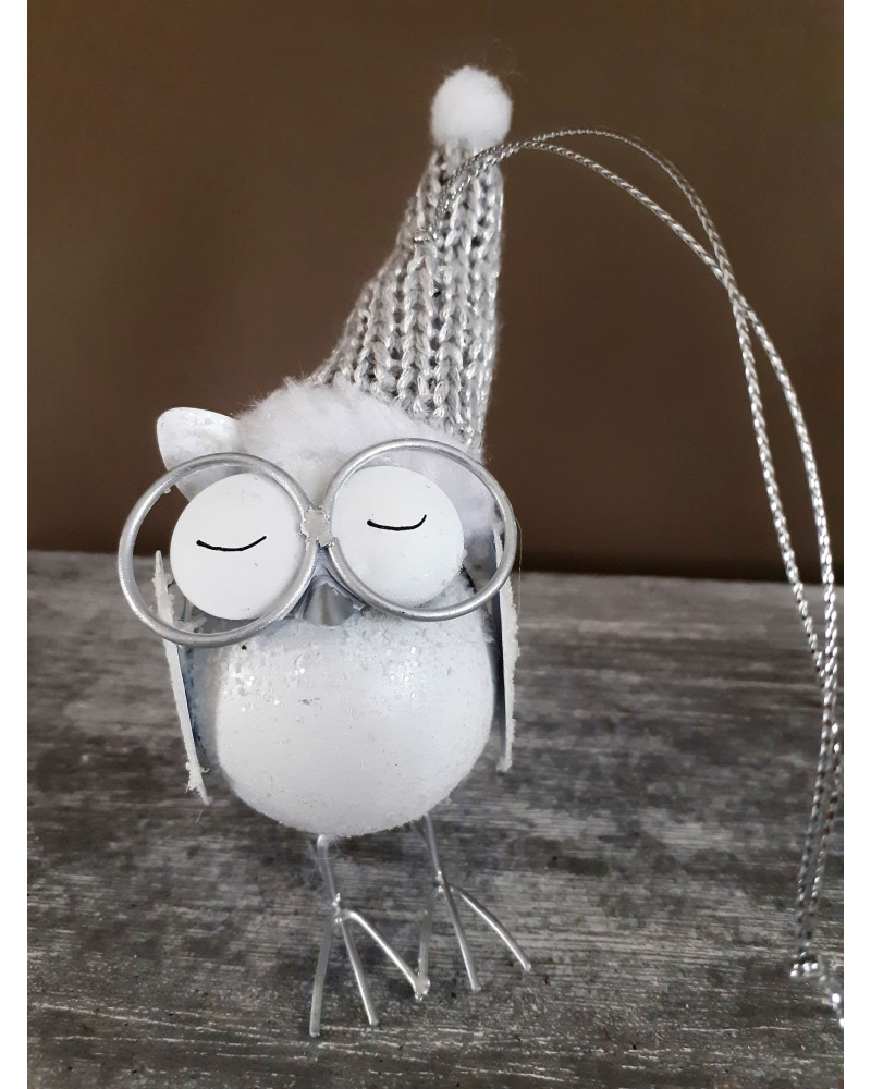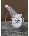Petit hiboux en métal décoré de lunettes et d'un bonnet.