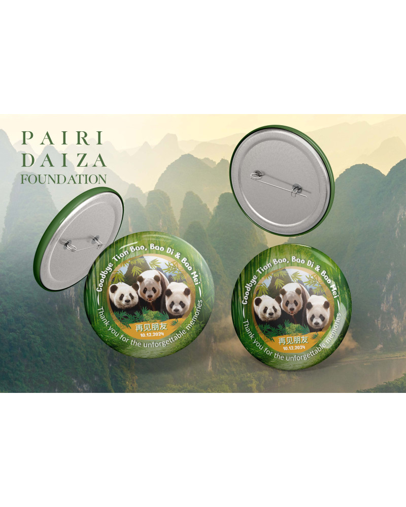 Ce mardi 10 décembre, Tian Bao, Bao Di et Bao Mei ont quitté notre parc pour rejoindre un centre de recherche et d’élevage dans le Sichuan, en Chine. Les pandas géants sont une espèce gravement menacée d’extinction. Afin de leur rendre hommage et contribuer à la sauvegarde de leur espèce, la Pairi Daiza Foundation vous propose ce badge spécial à l’effigie de nos 3 pandas nés à Pairi Daiza. En arborant ce symbole, vous participez directement aux efforts mondiaux de conservation et affirmez votre engagement pour protéger ces animaux emblématiques.