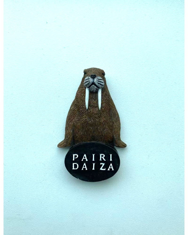 Un magnet en résine figurant un morse impressionnant, emblématique des régions arctiques, issu de la collection officielle Pairi Daiza.