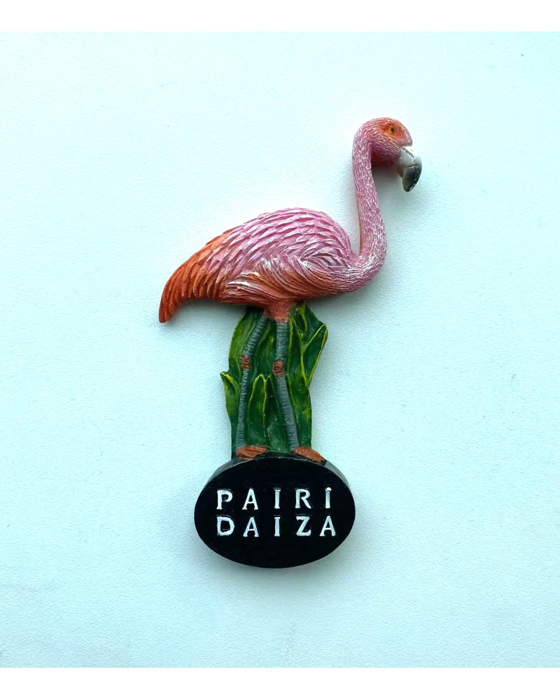 Un magnet en résine élégant et coloré représentant un flamant rose, souvenir raffiné du parc Pairi Daiza.