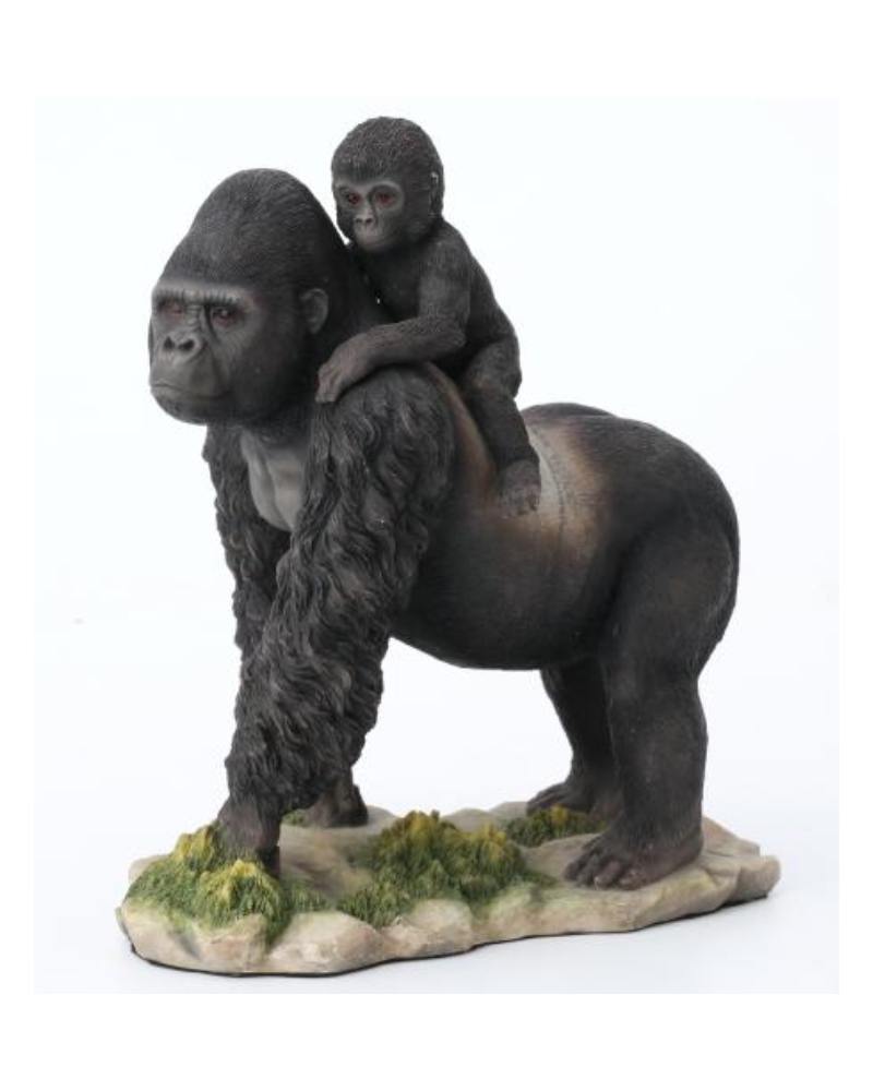 Figurine en résine représentant un gorille majestueux portant son petit sur le dos.