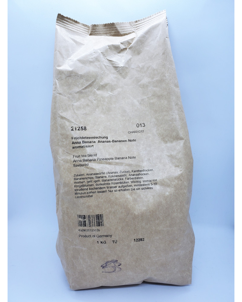 - Cubes d'ananas (sucre, ananas), flocons de carottes, bananes frites (bananes, huile de coco), flocons d'ananas, arômes, morceaux de banane gelée séchée, fleurs de carthame, fleurs de soucis, bourgeons de rose