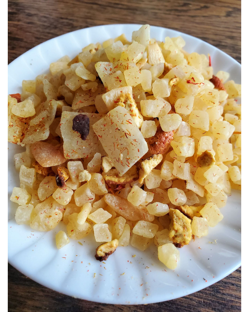 Une mixture qui irradie la bonne humeur basée sur des morceaux de fruits tropicaux et l’ Aloe Vera.