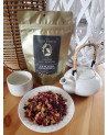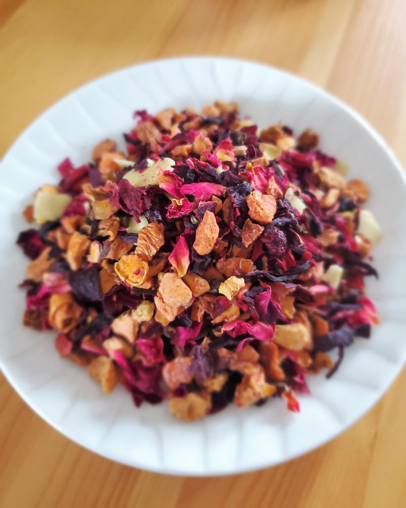 + morceaux de pomme, fleurs d’hibiscus, amandes effilées, arôme, semence de cardamome, betterave rouge, fleurs de rose, morceaux de griotte lyophilisé, grains de grenade (lila)