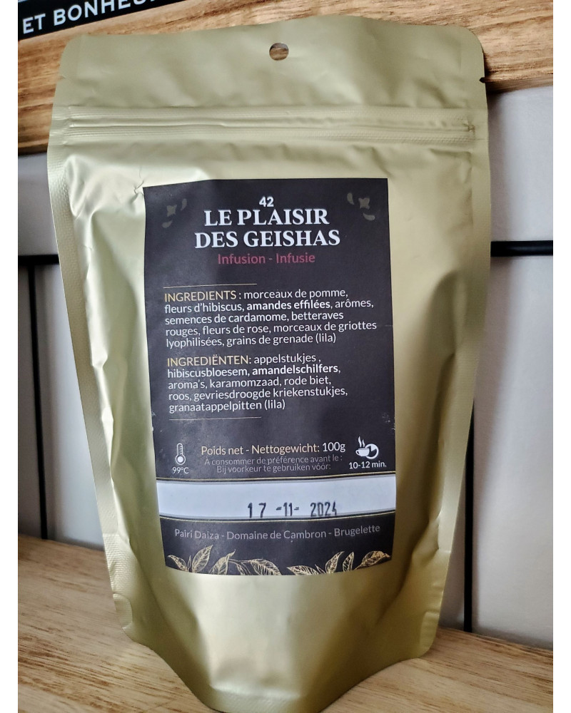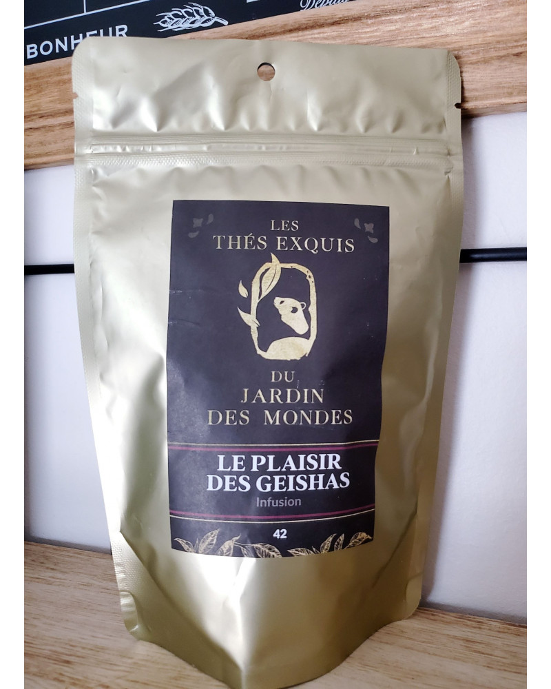 Un accord de cerise, un arpège de grenade, des éclats d’amandes, des pétales séchés de rose rouge et des gousses de cardamome, c’est un thé subtil comme le sourire de porcelaine d’une geisha.
