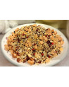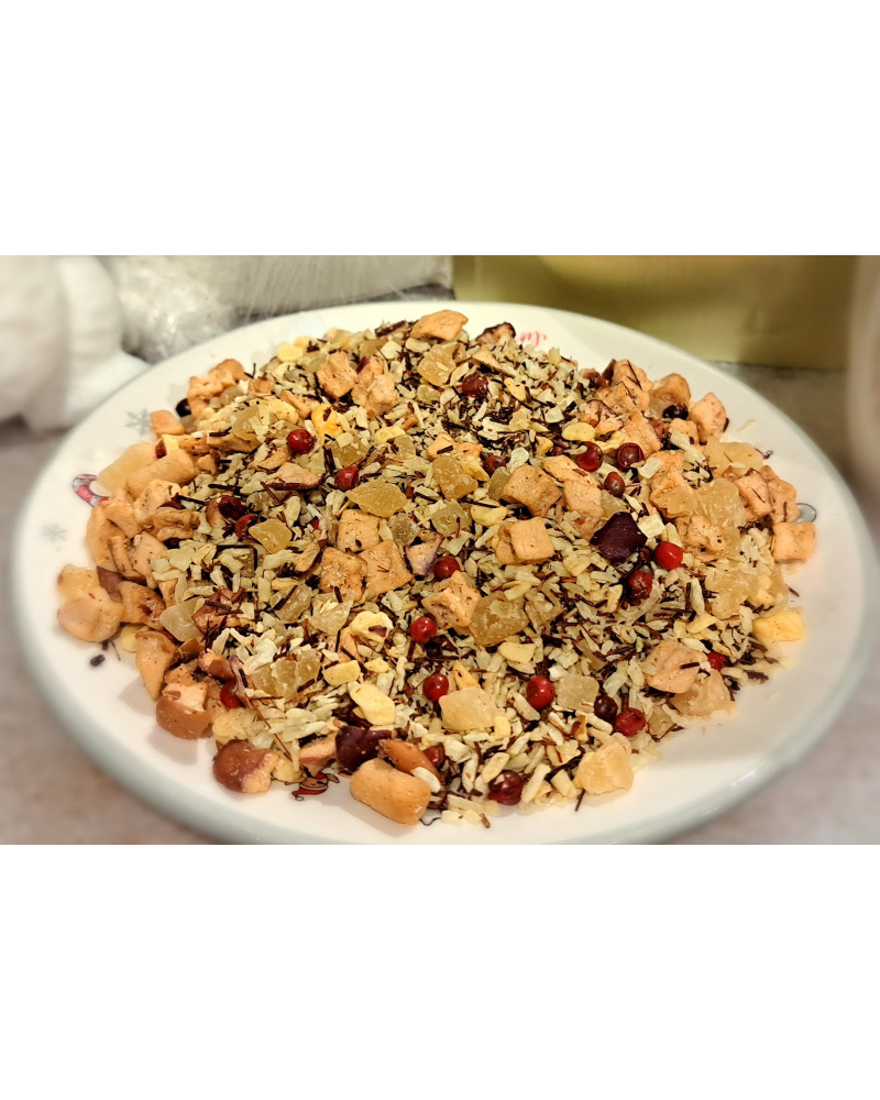 coco râpée, morceaux d'ananas (ananas, sucre), thé Rooibos, pommes en cube, arôme, granules de yaourt lyophilisées (yaourt demi-écrémé, sucre), gouttes de massepain lyophilisés (amande, sucre), grains de poivre rose