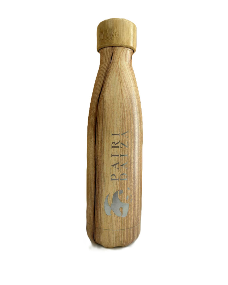 Gourde isotherme différents motifs et bouchon en imitation bois. Elle porte le logo vertical de Pairi Daiza avec la silhouette du panda, idéale comme souvenir pratique du parc.