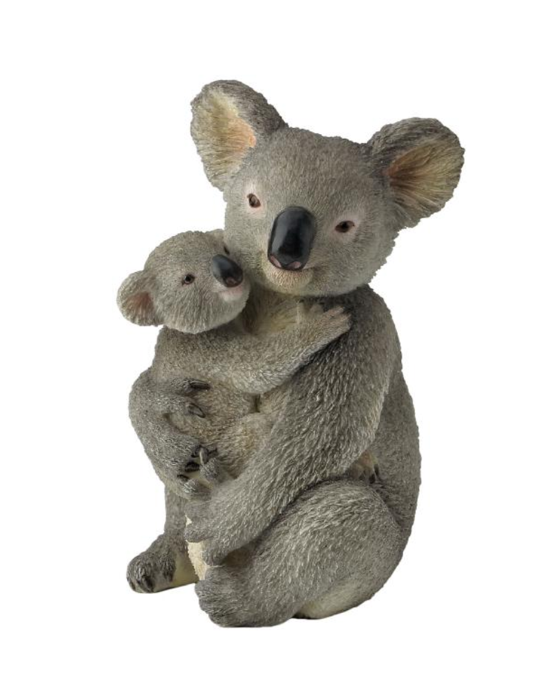 Harsbeeld van een koala met haar kleintje in een vertederende omhelzing.