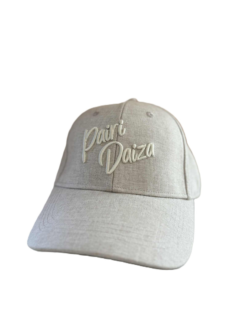 Een elegante pet van natuurlijke linnen, verfijnd geborduurd met de naam Pairi Daiza.