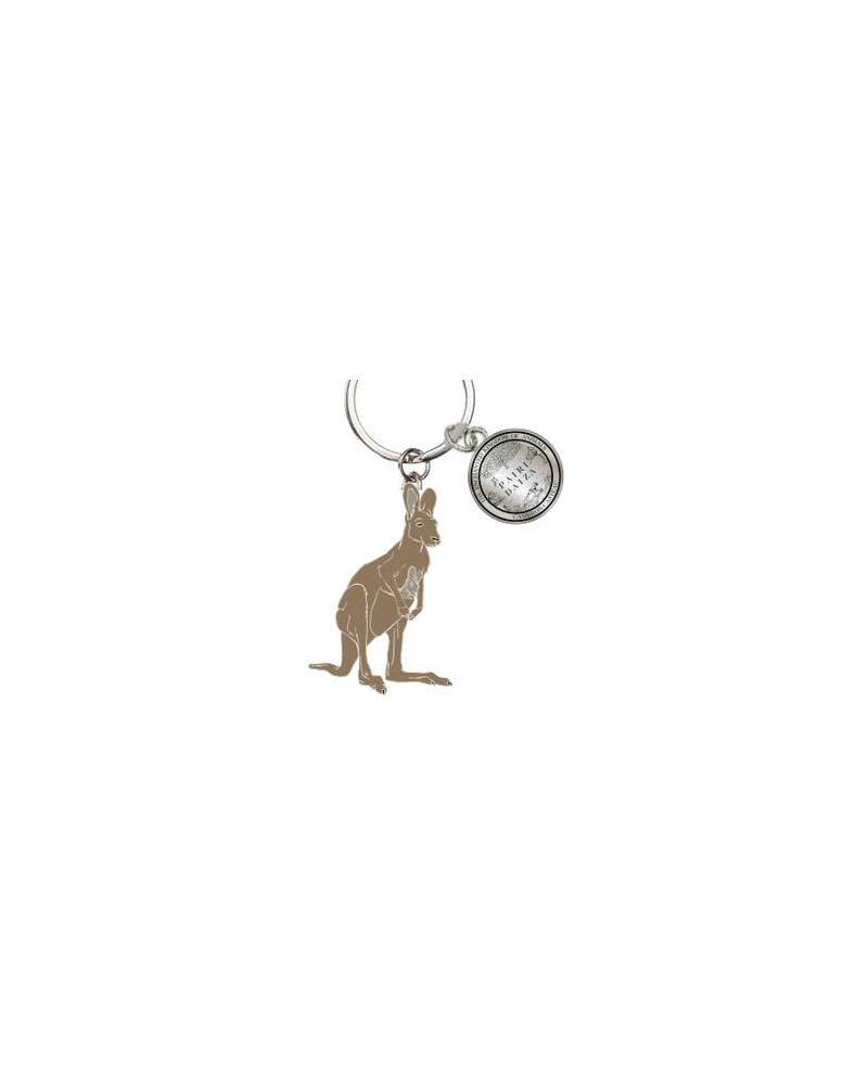 Een originele metalen sleutelhanger in de vorm van een kangoeroe met een bedeltje van Pairi Daiza.