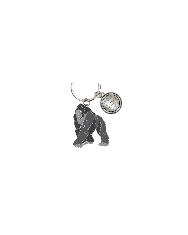 Een originele metalen sleutelhanger in de vorm van een goril met een bedeltje van Pairi Daiza.