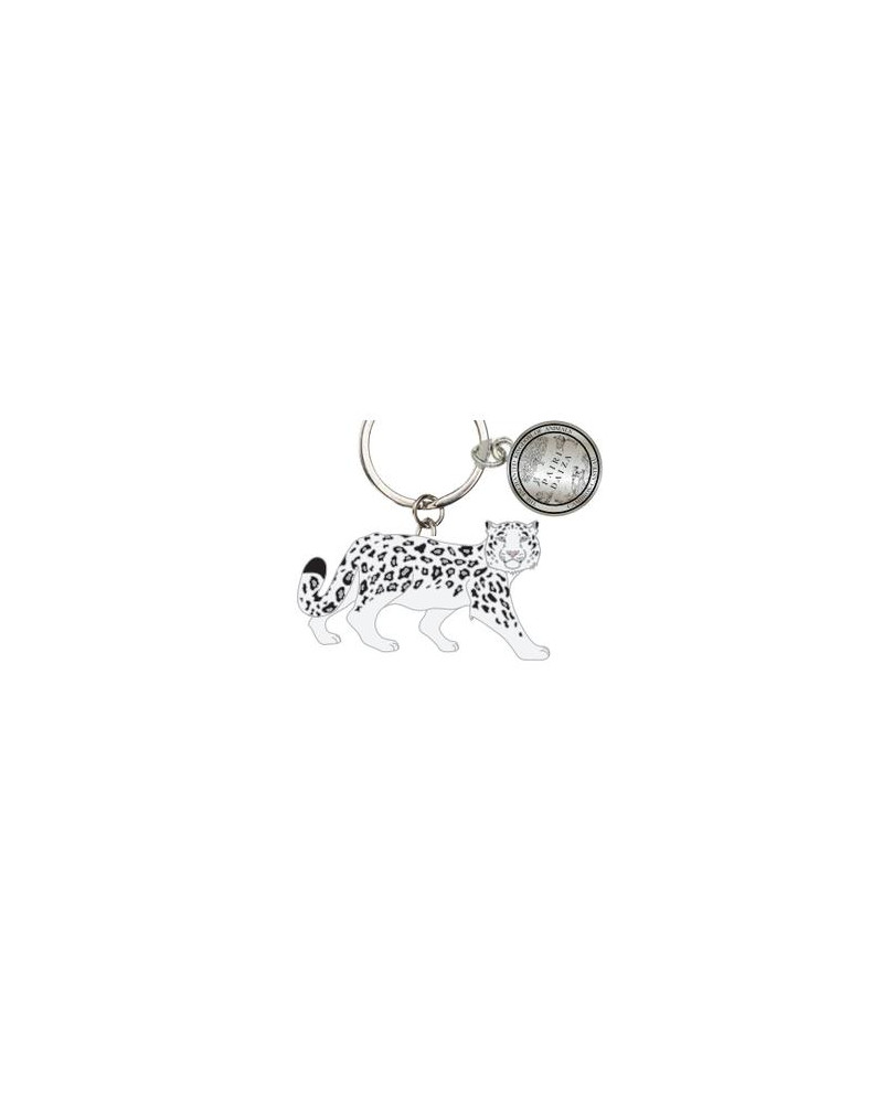 Een originele metalen sleutelhanger in de vorm van een sneeuwpanther met een bedeltje van Pairi Daiza.