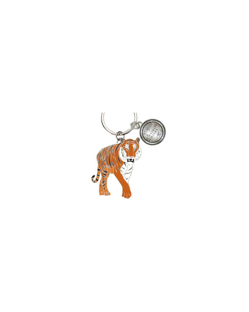 Een originele metalen sleutelhanger in de vorm van een tijger met een bedeltje van Pairi Daiza.
