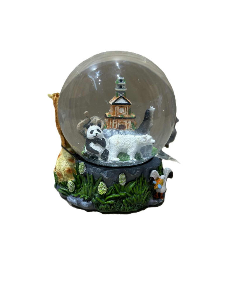 Een magische sneeuwbol met verschillende iconische dieren uit het park.
