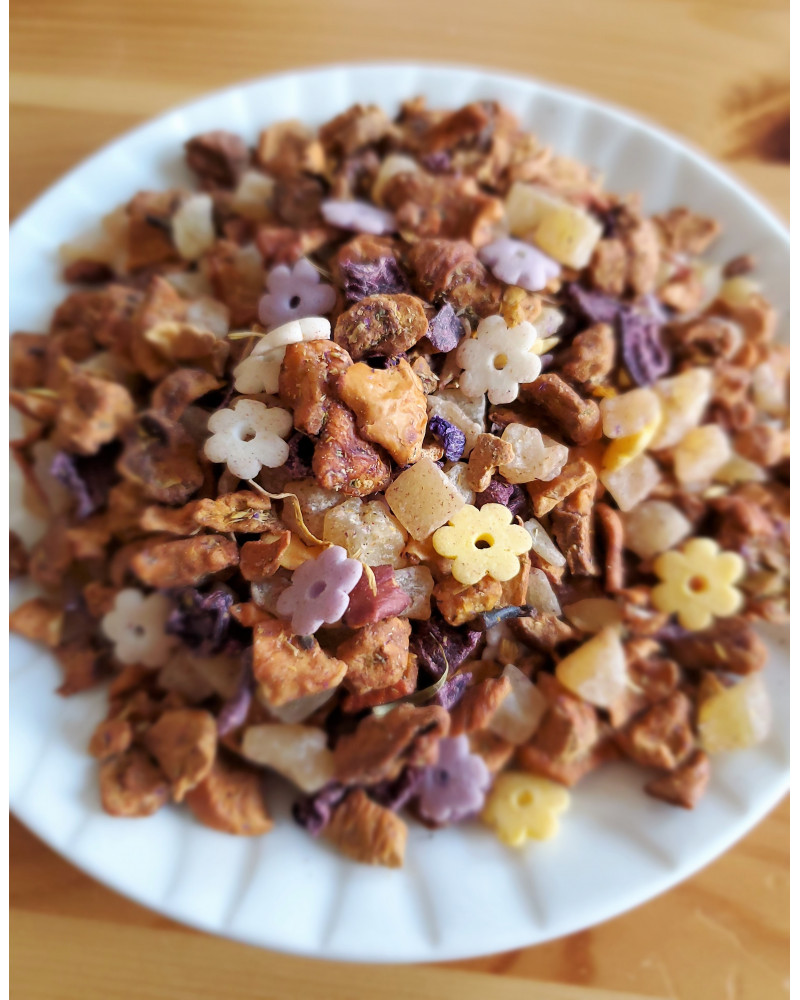 Het geheel wordt omgeven door smaken van goudsbloem, viooltjes en andere gekleurde suikerbloemen.