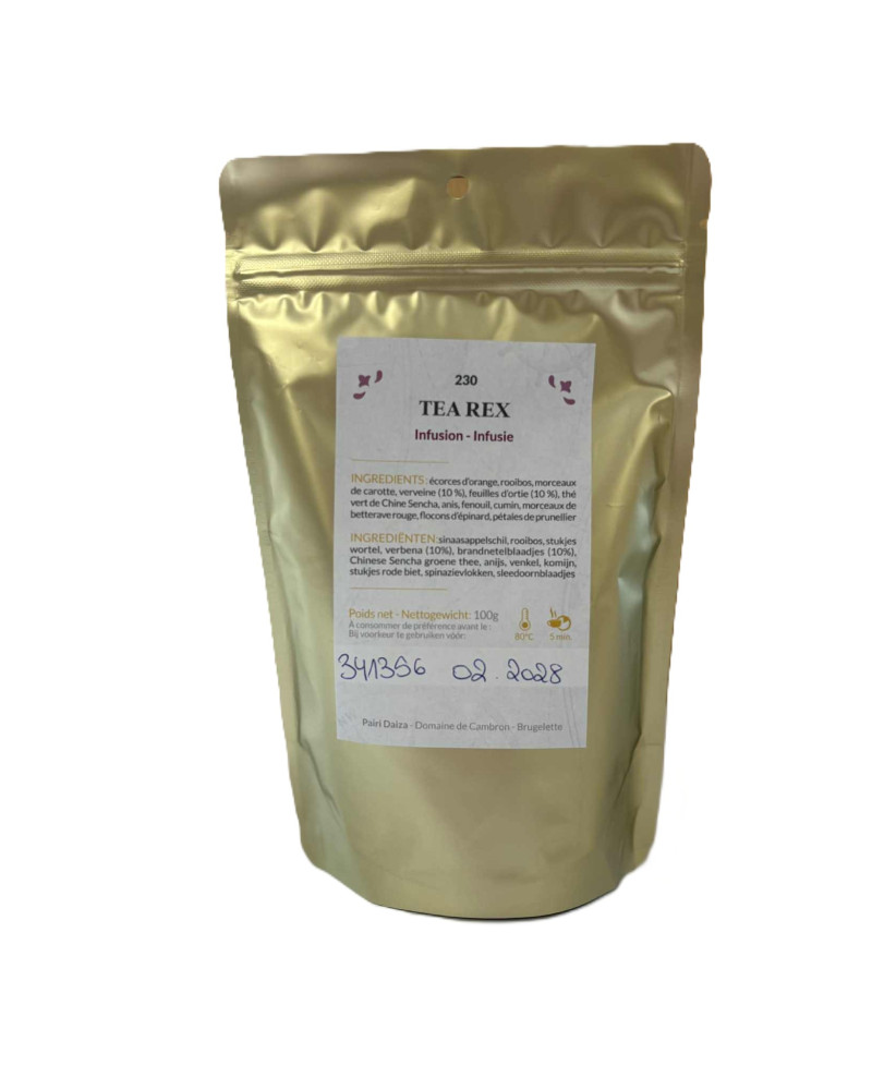 - sinaasappelschil, rooibos, stukjes wortel, verbena(10%), brandnetelblaadjes(10%), Chinese Sencha groene thee, anijs, venkel, komijn, stukjes rode biet, spinazievlokken, sleedoornblaadjes.